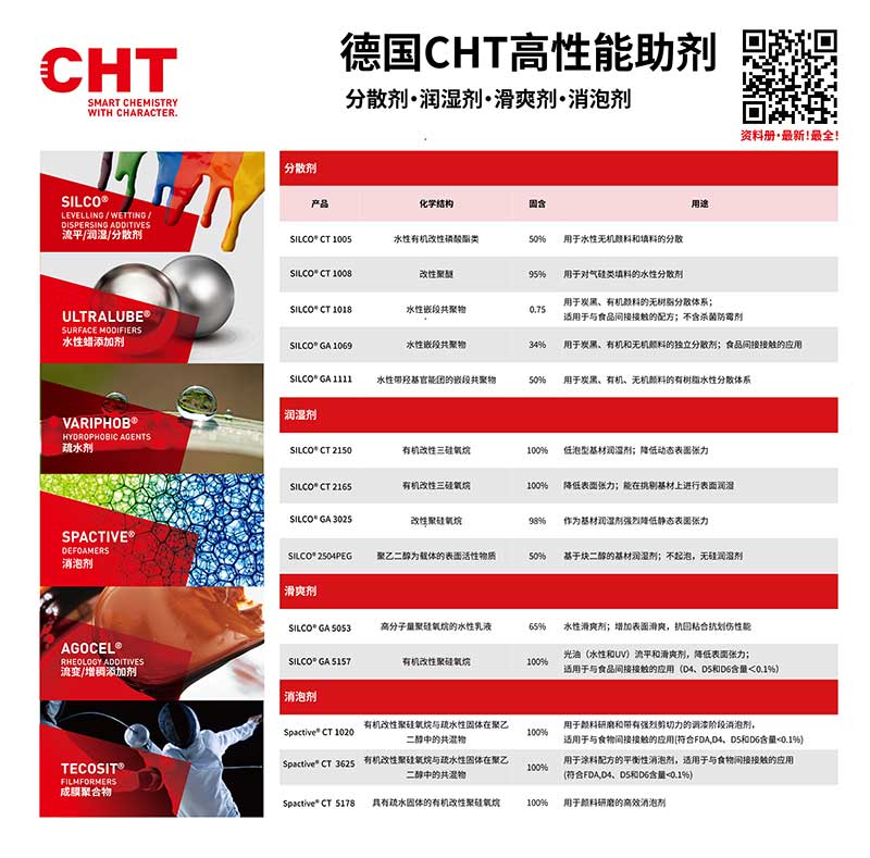 德国CHT高性能助剂系列,专注于为涂料、油墨、胶粘剂及工业化学品提供卓越的表面处理解决方案。产品涵盖分散剂、润湿剂、滑爽剂和消泡剂四大类,广泛应用于水性体系与多种基材中。如SILCO®系列分散剂可高效稳定颜填料,提升体系稳定性;ULTRALUBE®表面改性剂改善涂层手感与抗刮性能;VARIPHOB®疏水剂赋予材料优异的防水防污能力;SPACTIVE®消泡剂有效控制泡沫,确保施工流畅;AGOCEL®流变助剂则优化体系粘度与触变性。所有产品均具备高效率、低添加量和环保安全的特点,助力客户实现高性能、高品质的配方开发。